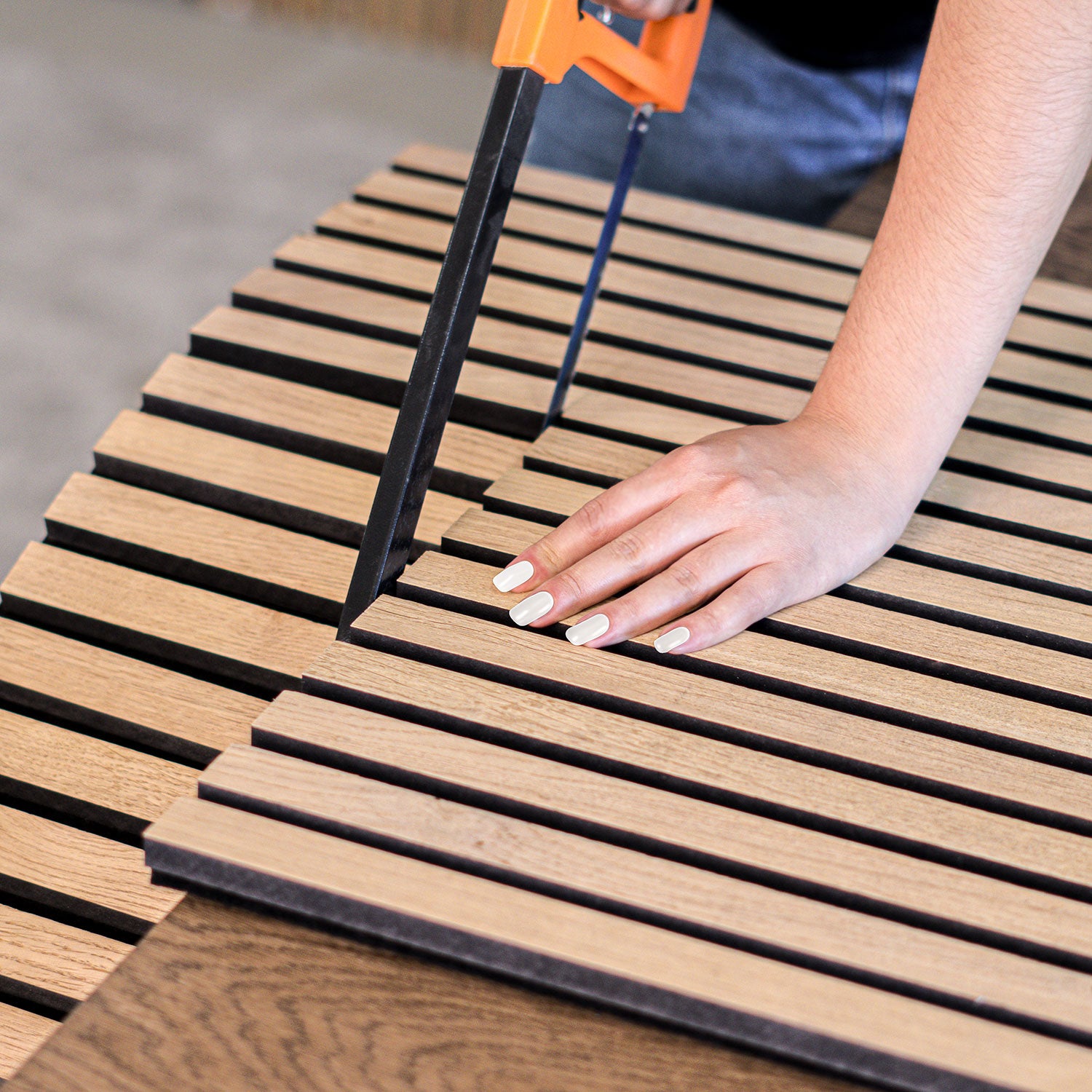 Le panneau acoustique Walleu est composé de 15 lattes, réparties uniformément avec un espacement de 13 mm, toutes reposant sur un feutre acoustique de 9 mm d'épaisseur.